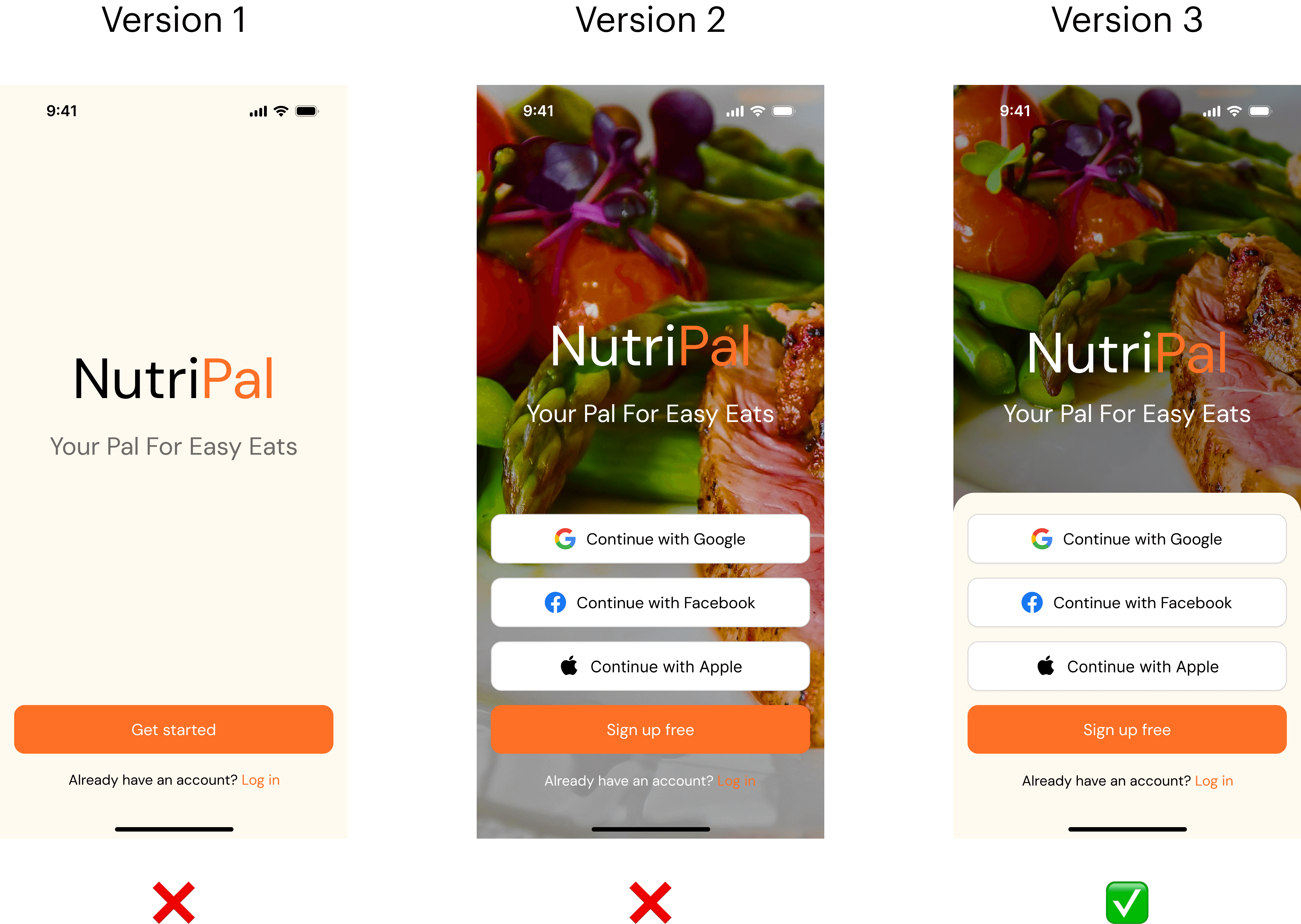 For the 'Get Started' screen, the initial version was simple and functional. Subsequent versions introduced vibrant food imagery to enhance visual appeal and readability, creating a more cohesive user experience.