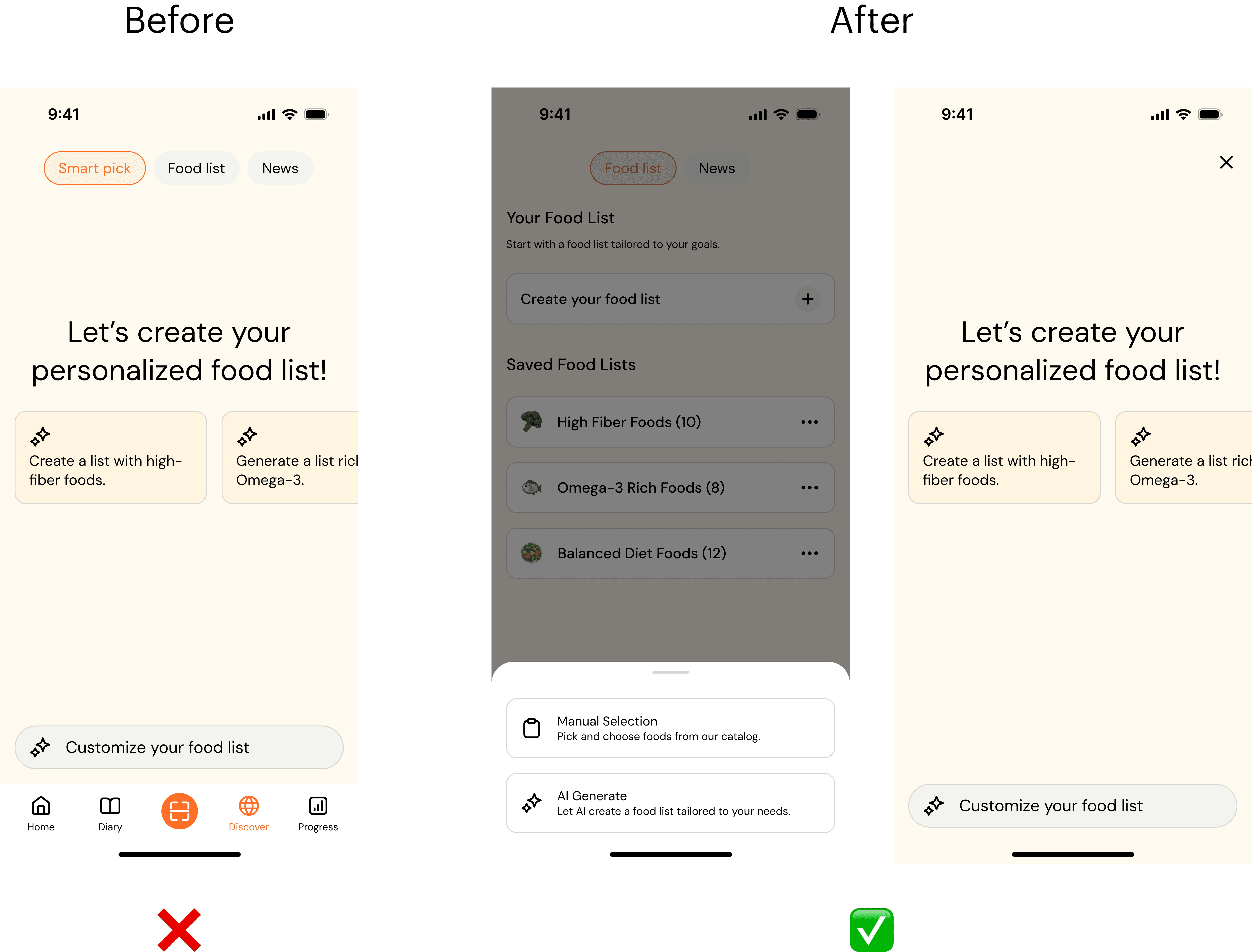 For the 'Food List' feature, the original design had separate sections for creating and managing food lists, which led to user disconnection. After feedback, these functions were unified, simplifying interaction and boosting engagement.