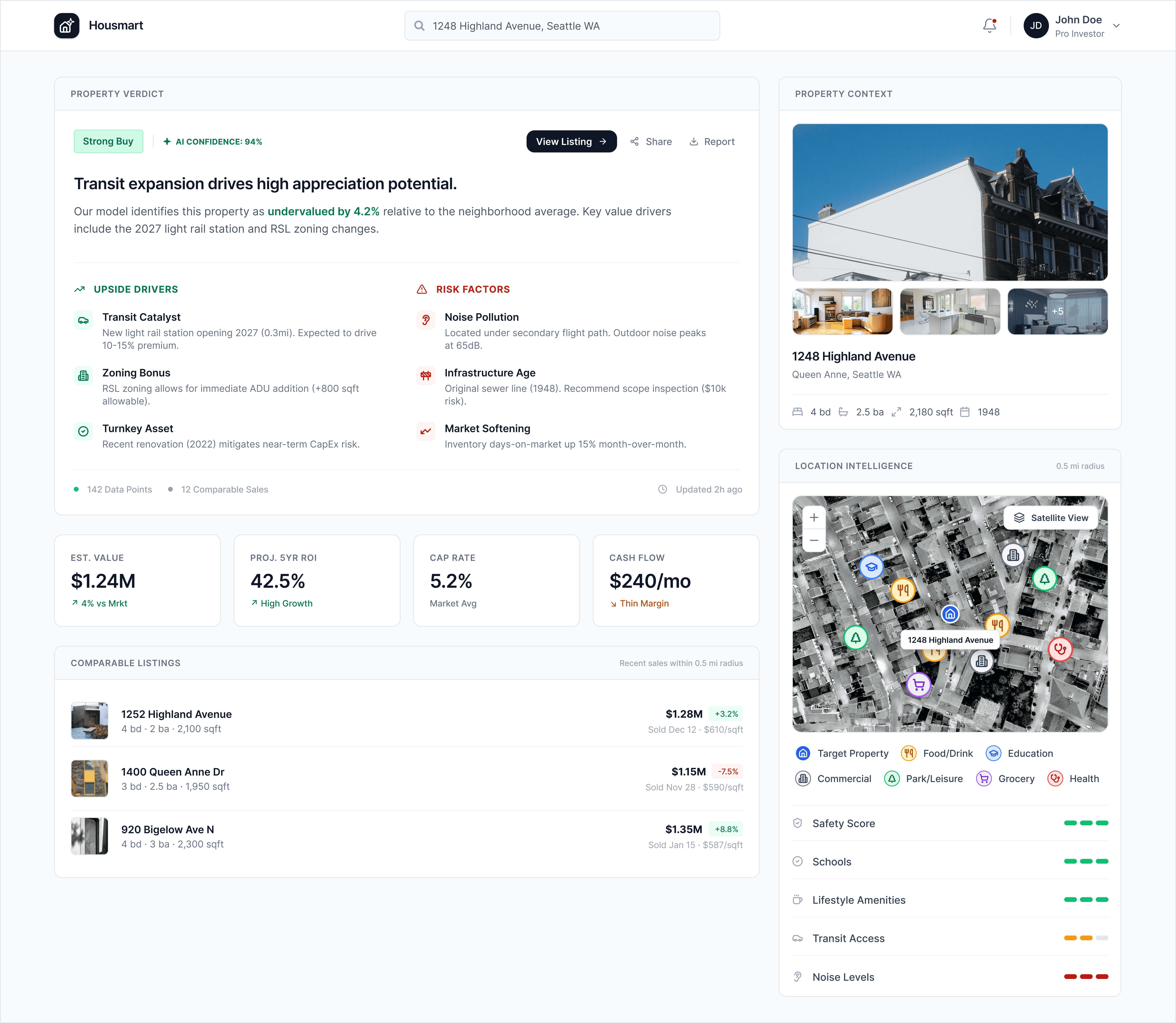 Solo project exploring how AI supports smarter home buying. Housmart is an AI-powered real estate decision dashboard that lets buyers evaluate a property by entering a single address, surfacing an AI verdict, key financial metrics, strategy fit, risks, upside drivers, and neighborhood signals in one calm, scannable view for confident long-term decisions.